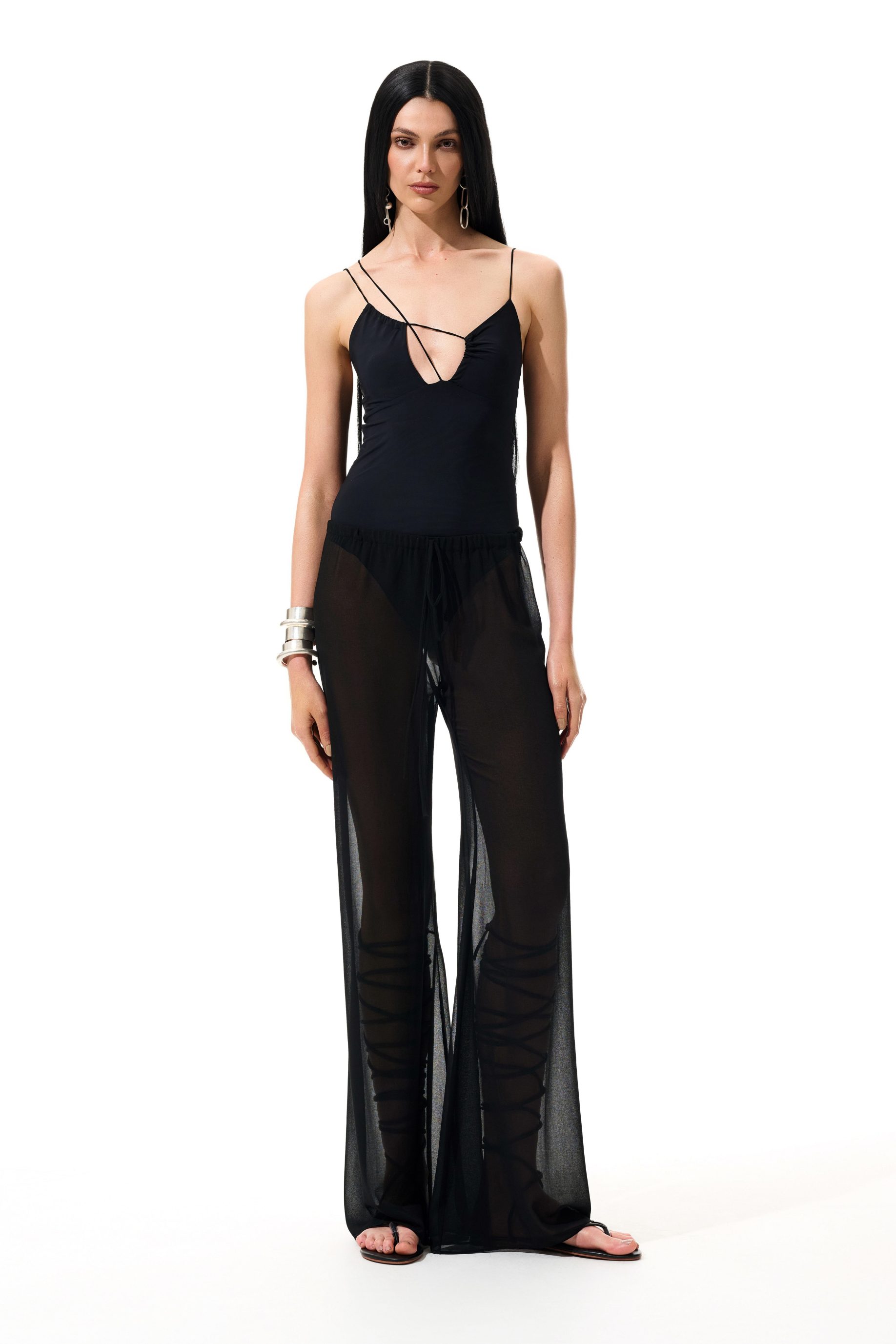 Calça reta em musseline preta. Cós elástico e amarração frontal que ajustam a peça no corpo. Modelagem cortada em viés, que proporciona caimento único e perfeito modelando a silhueta. Caimento fluído e levemente evasê. Peça versátil e marcante, ideal para produções especiais.