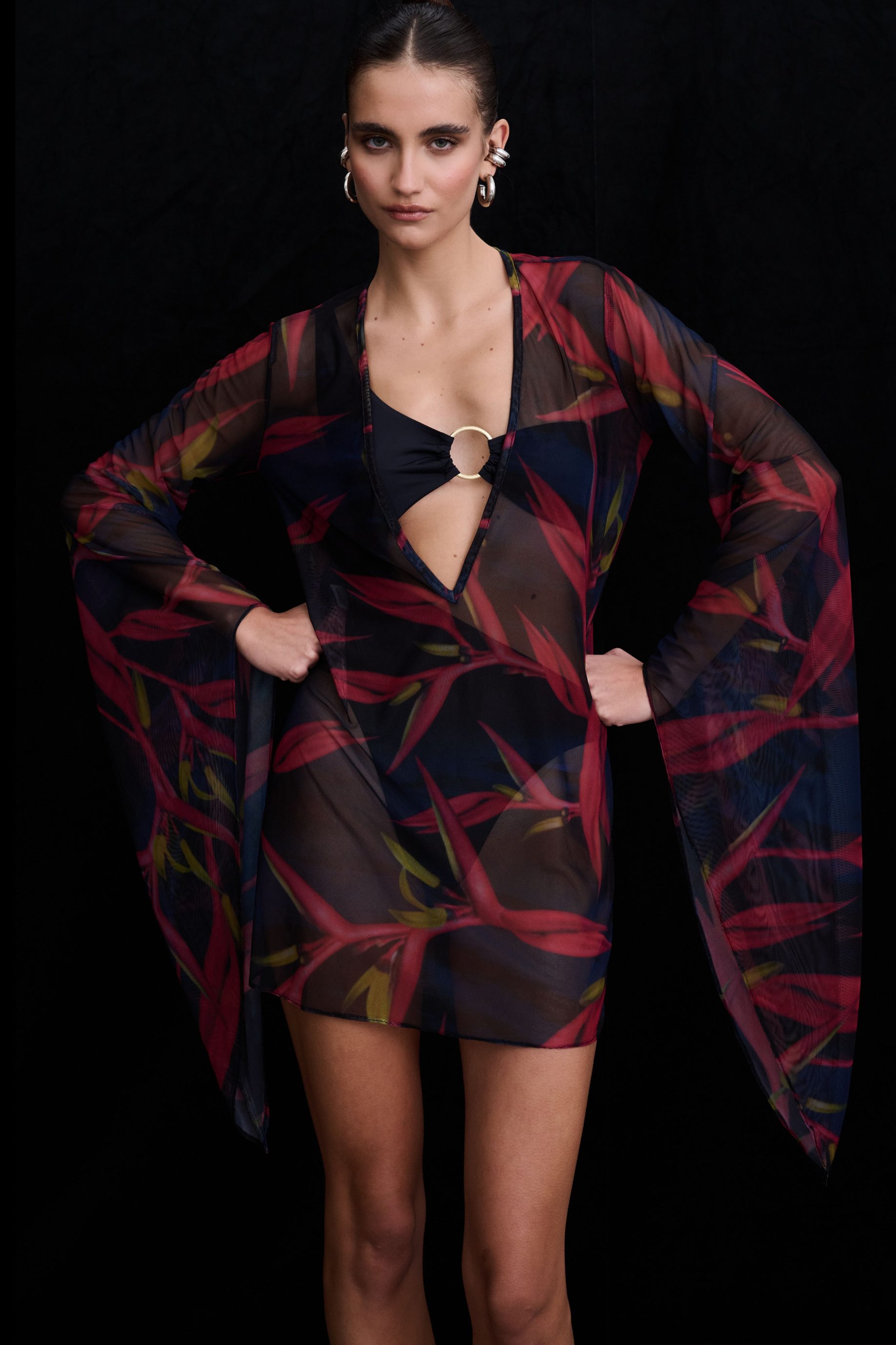Vestido em tule com estampa digital exclusiva. Modelo de mangas longas e decote profundo, com argola metálica central que cria um delicado franzido e valoriza o busto.
