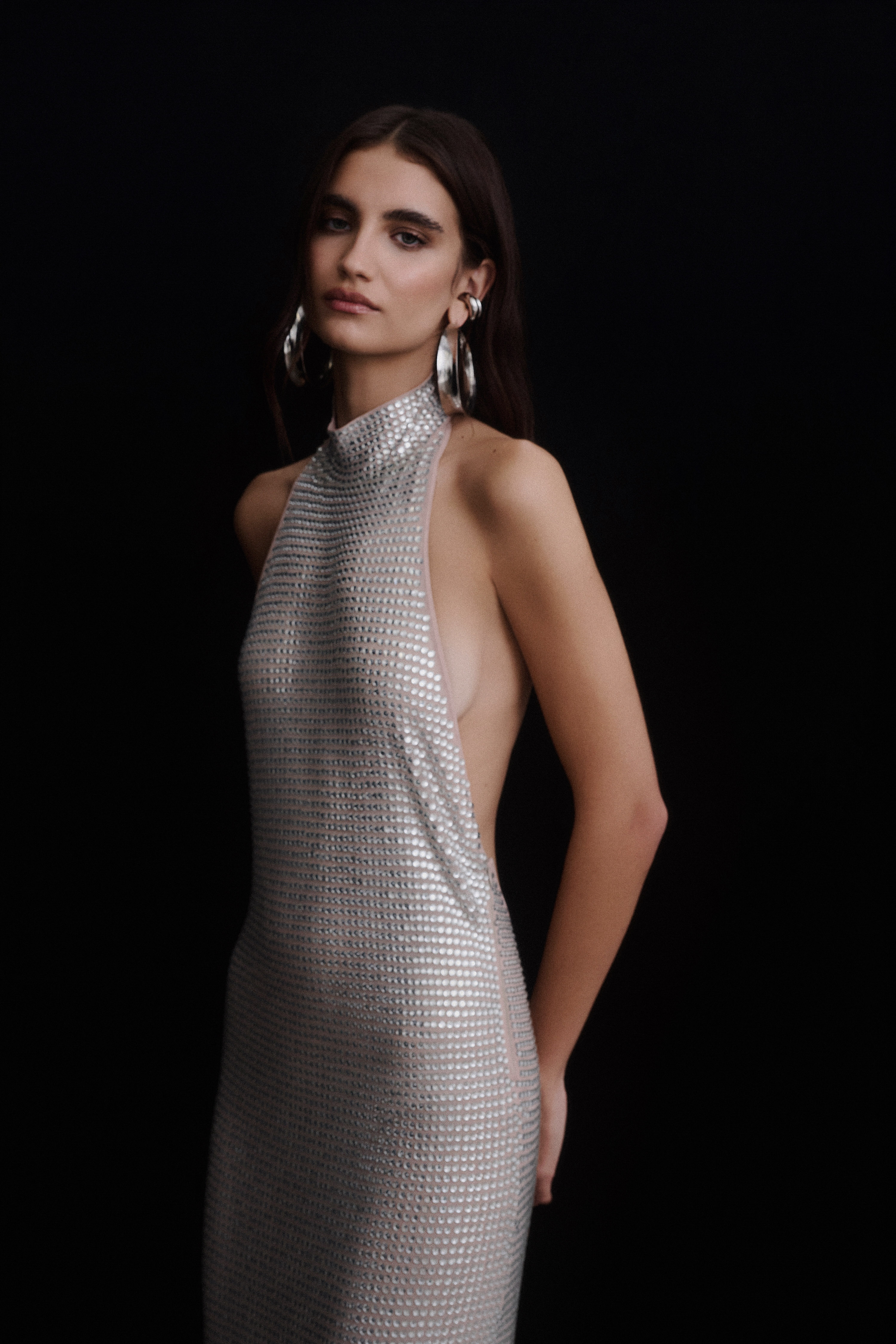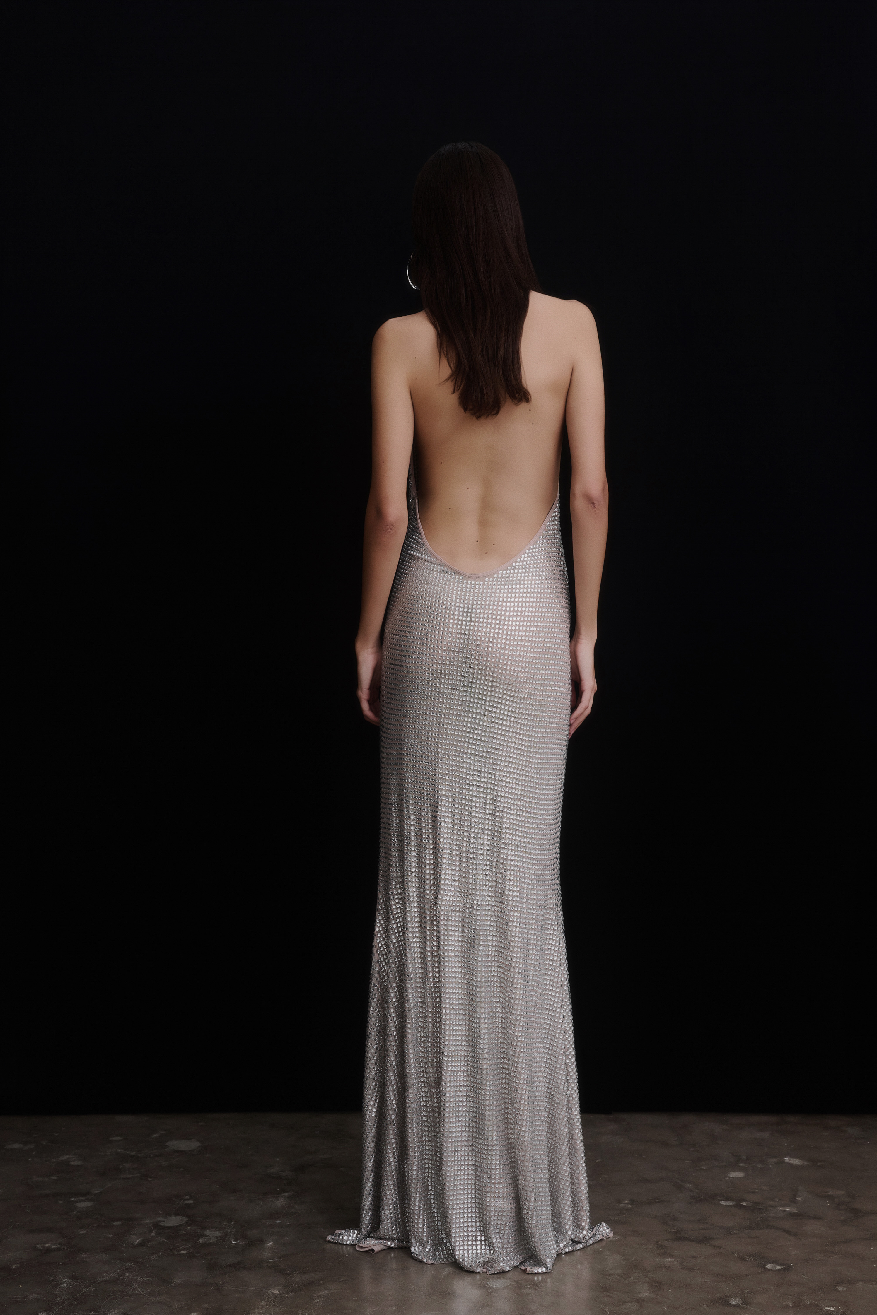 Vestido longo de cristais confeccionado em tule nude, com aplicação de cristais termo-colantes que criam um efeito luminoso e sofisticado, A modelagem sereia valoriza as curvas e o decote frente única traz sensualidade e elegância na medida certa.