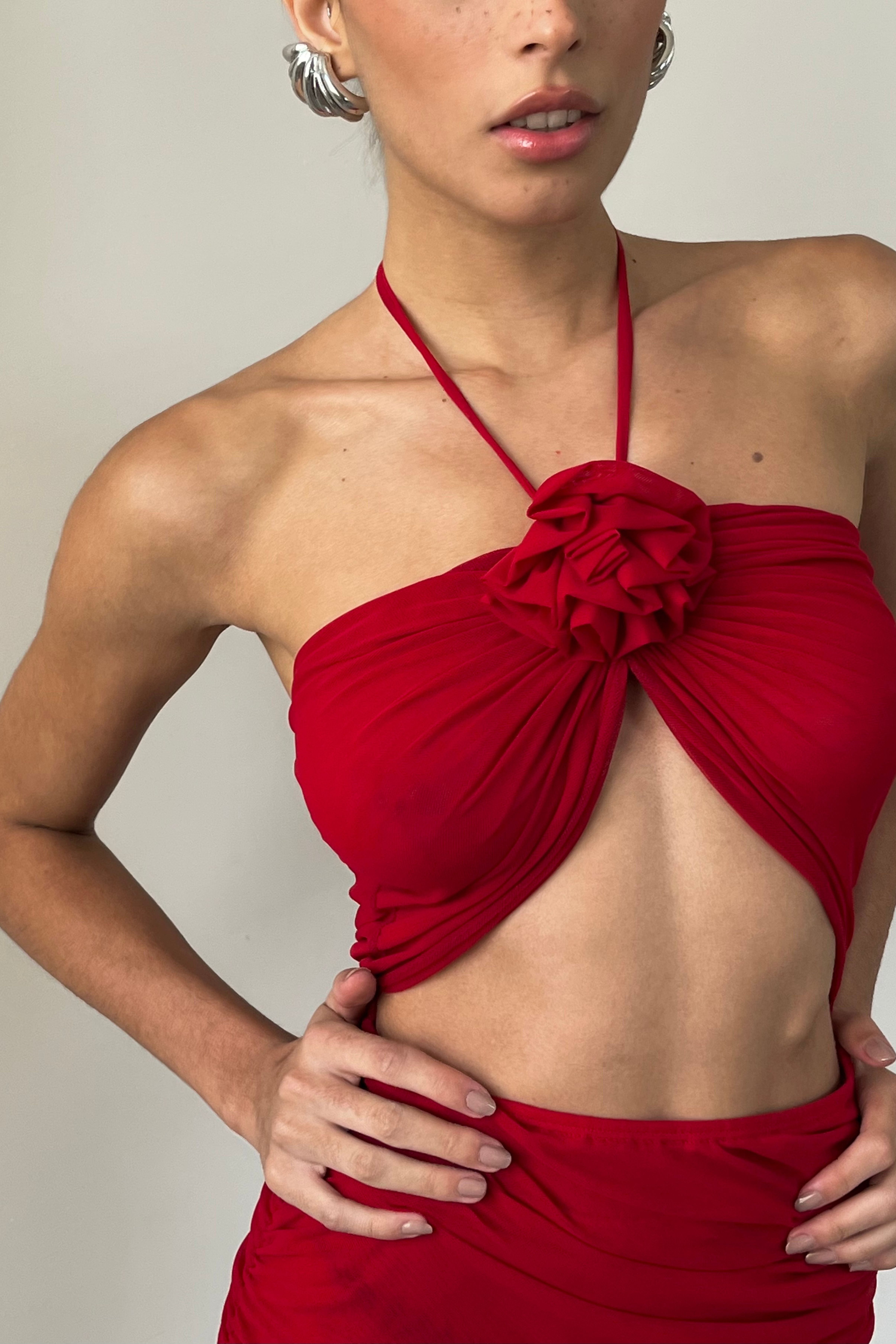 Vestido de tule, todo duplo. Saia toda drapeada, e parte de cima com recorte na barriga e flor feita artesanalmente no mesmo tecido.