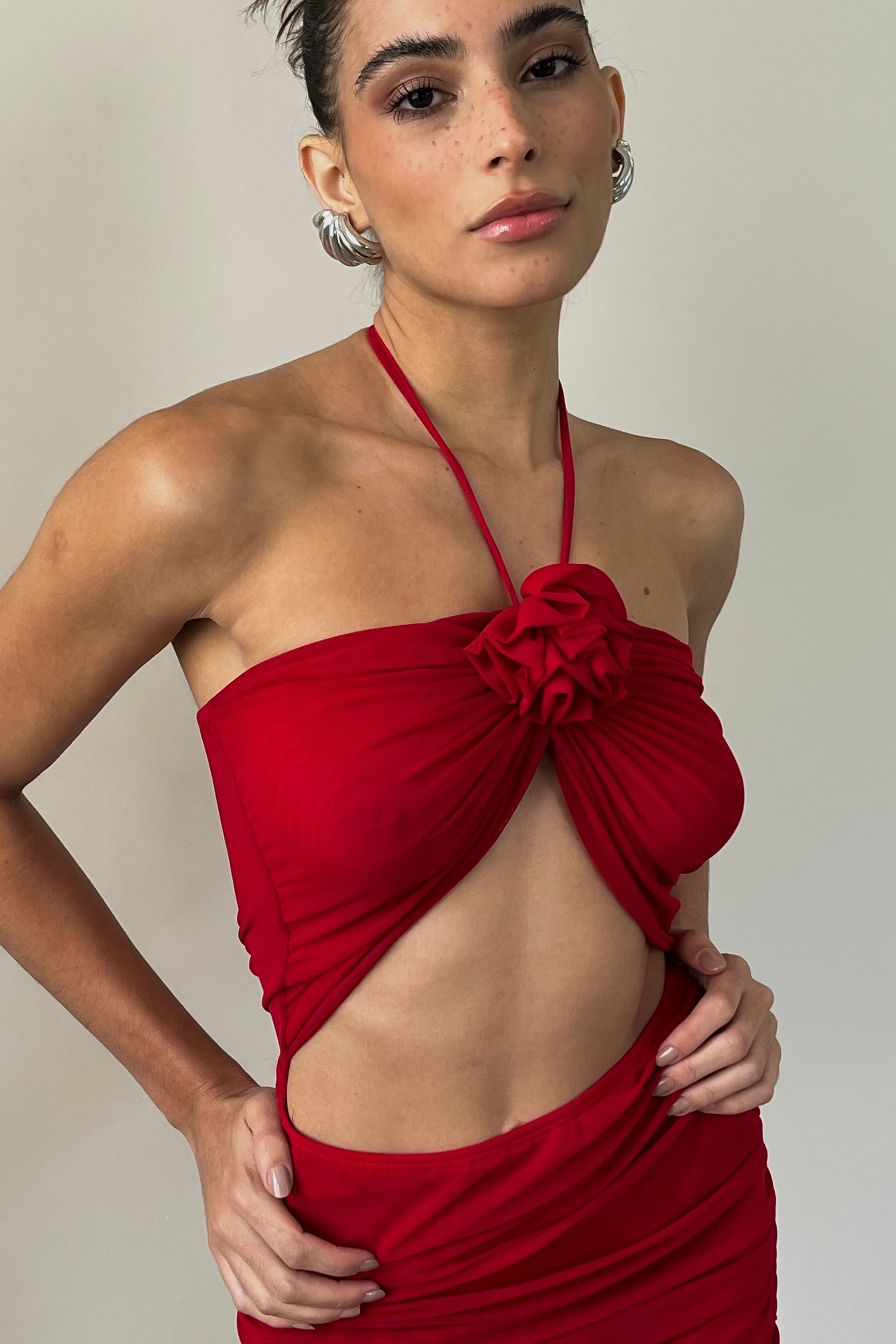 Vestido de tule com estampa digital exclusiva, todo duplo. Saia toda drapeada, e parte de cima com recorte na barriga e flor feita artesanalmente no mesmo tecido.