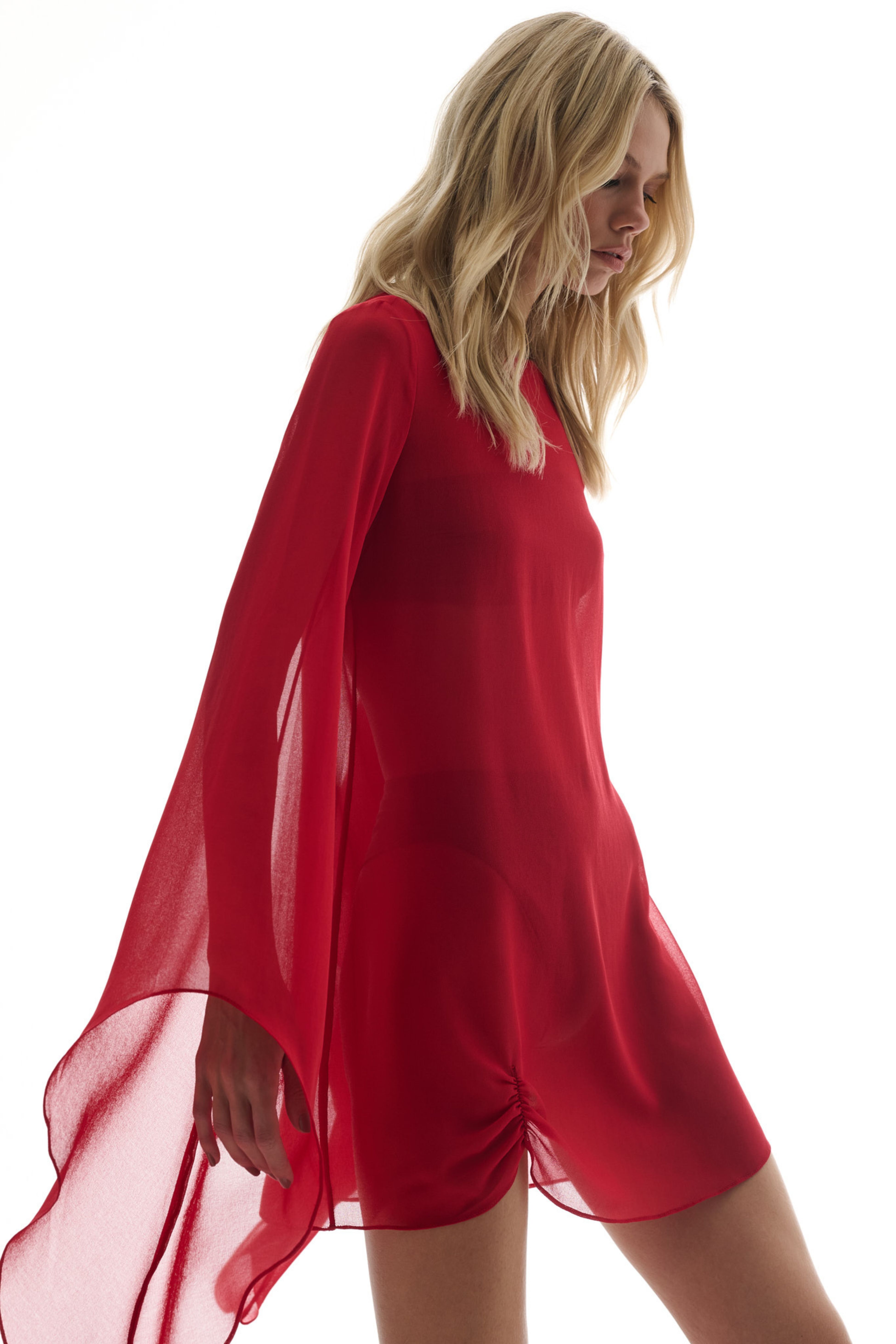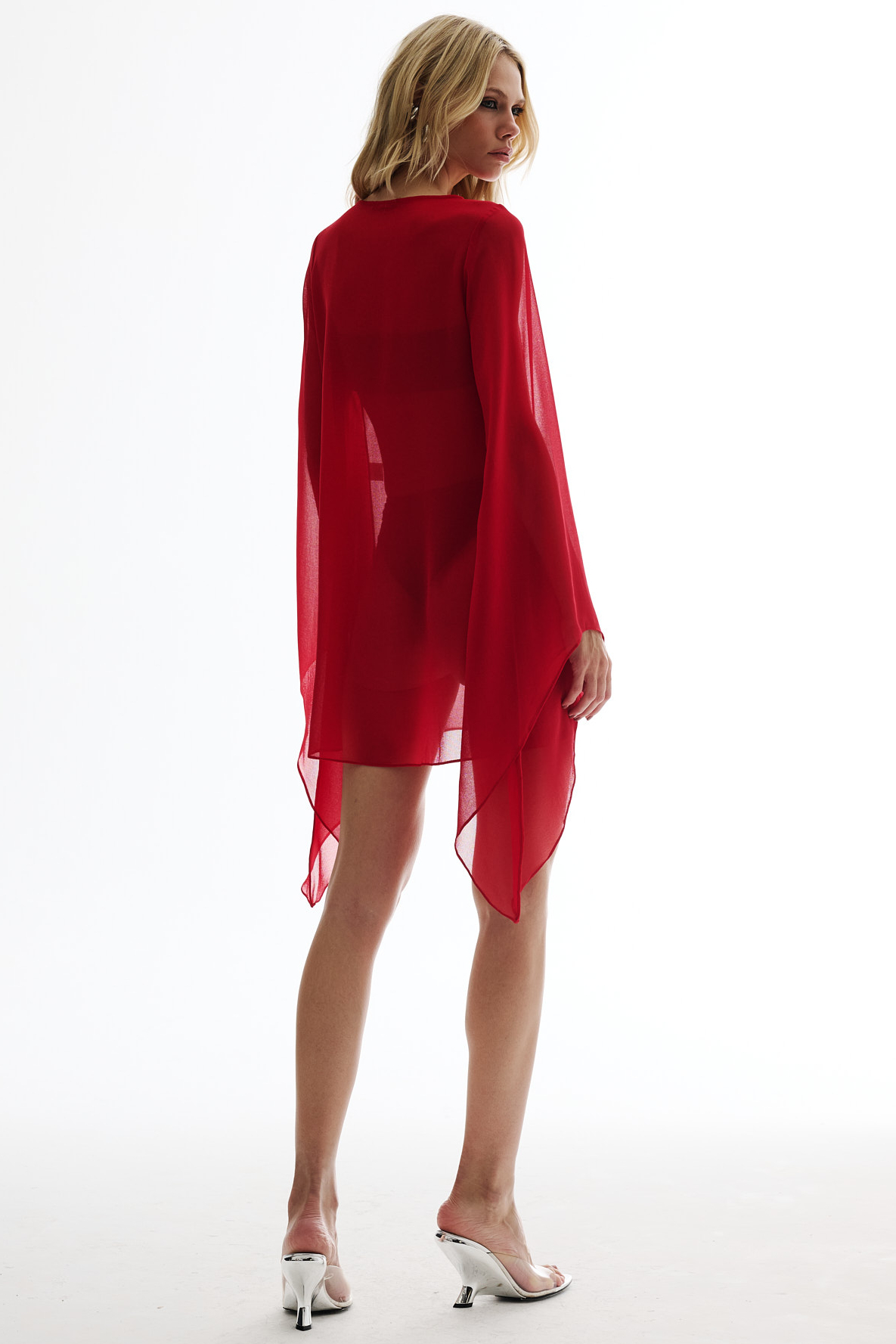 Modelagem leve e fluida, com mangas longas assimétricas de caimento solto. O drapeado lateral forma uma pequena fenda, trazendo movimento e delicadeza ao look. A transparência do tecido adiciona um toque moderno e sofisticado.