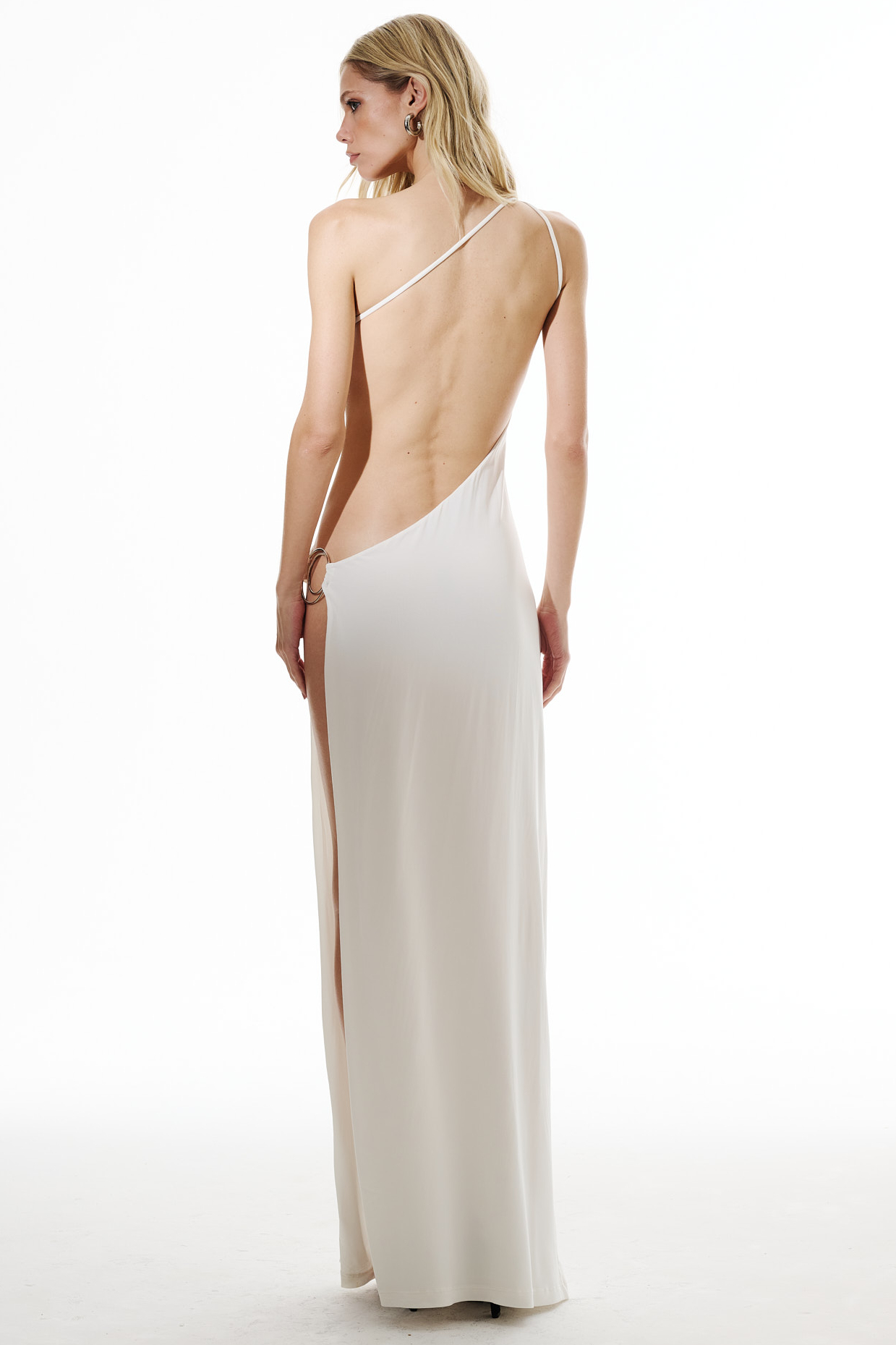 Vestido longo assimétrico em Jersey off-white, todo duplo.